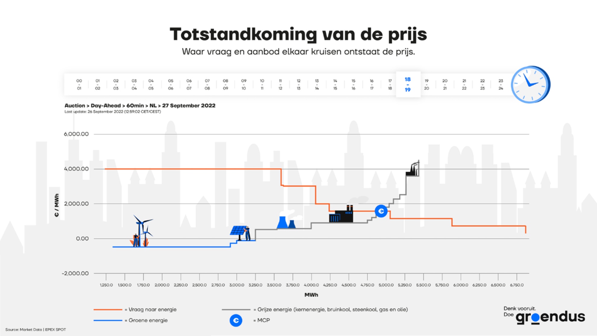 Op de dagmarkt zijn producenten van zowel grijze als groene stroom actief. In de grafiek hebben we daarom gevisualiseerd waar de producenten van verschillende soorten stroom in de merit order zitten. Wat meteen opvalt, is dat producenten van zonne- en windenergie hun stroom op of zelfs onder de € 0 aanbieden. Dat heeft onder andere te maken met subsidies. Met subsidie zijn veel duurzame producenten al kostendekkend en kunnen ze dus onder de 0 inbieden.