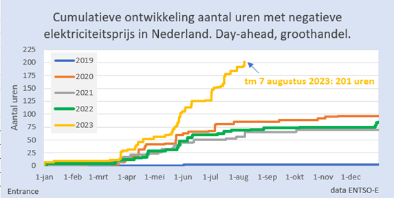 - In 2023 deden zich twee opvallende ontwikkelingen voor. Het volledige jaar bleven de energieprijzen hoog. En tegelijkertijd hadden we nog nooit zoveel uur met negatieve energieprijzen.
