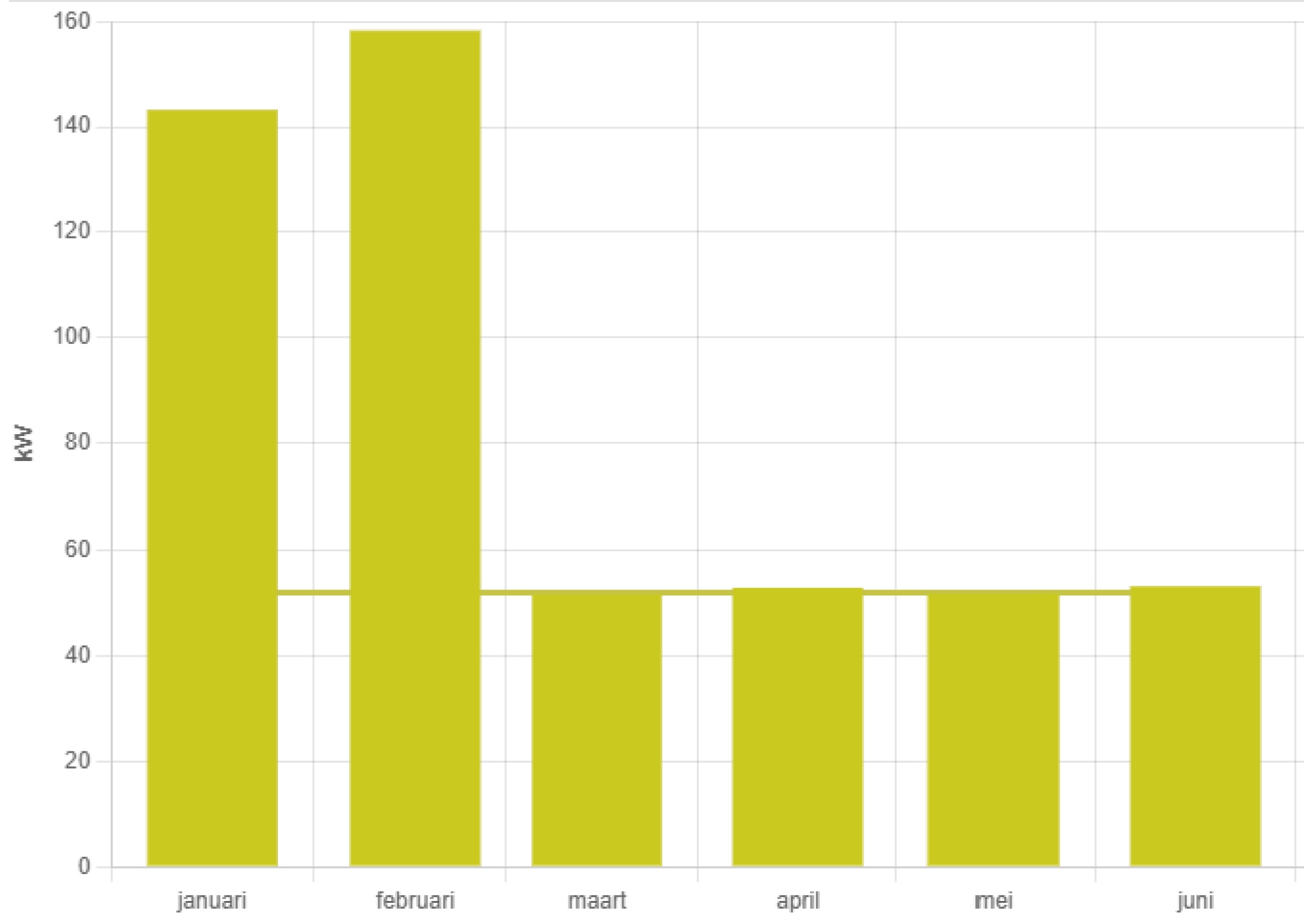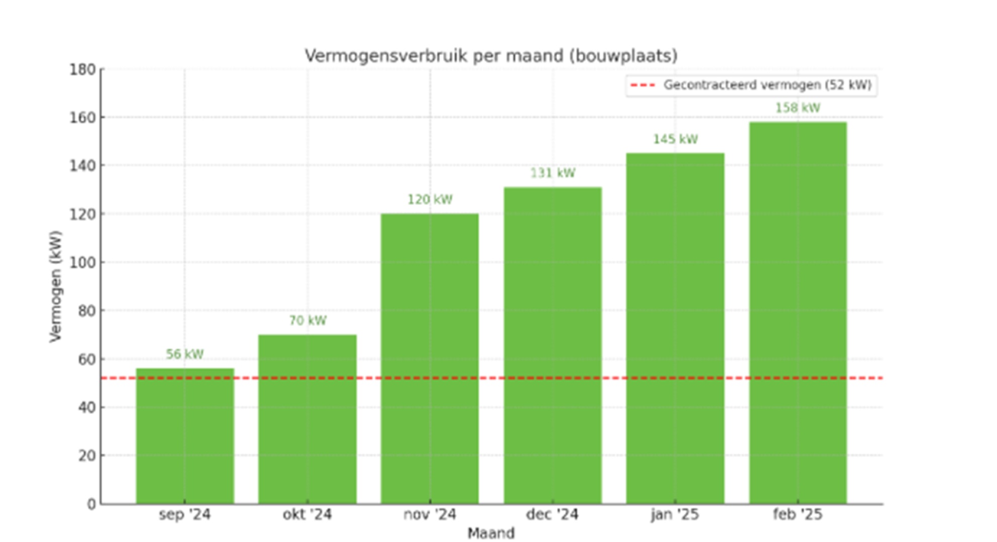 Het bouwbedrijf kreeg al meerdere waarschuwingen van de netbeheerder. Maandenlang werd het gecontracteerde vermogen overschreden. In februari piekte het verbruik zelfs op 158 kW, drie keer zoveel als toegestaan. Zie de grafiek hieronder.