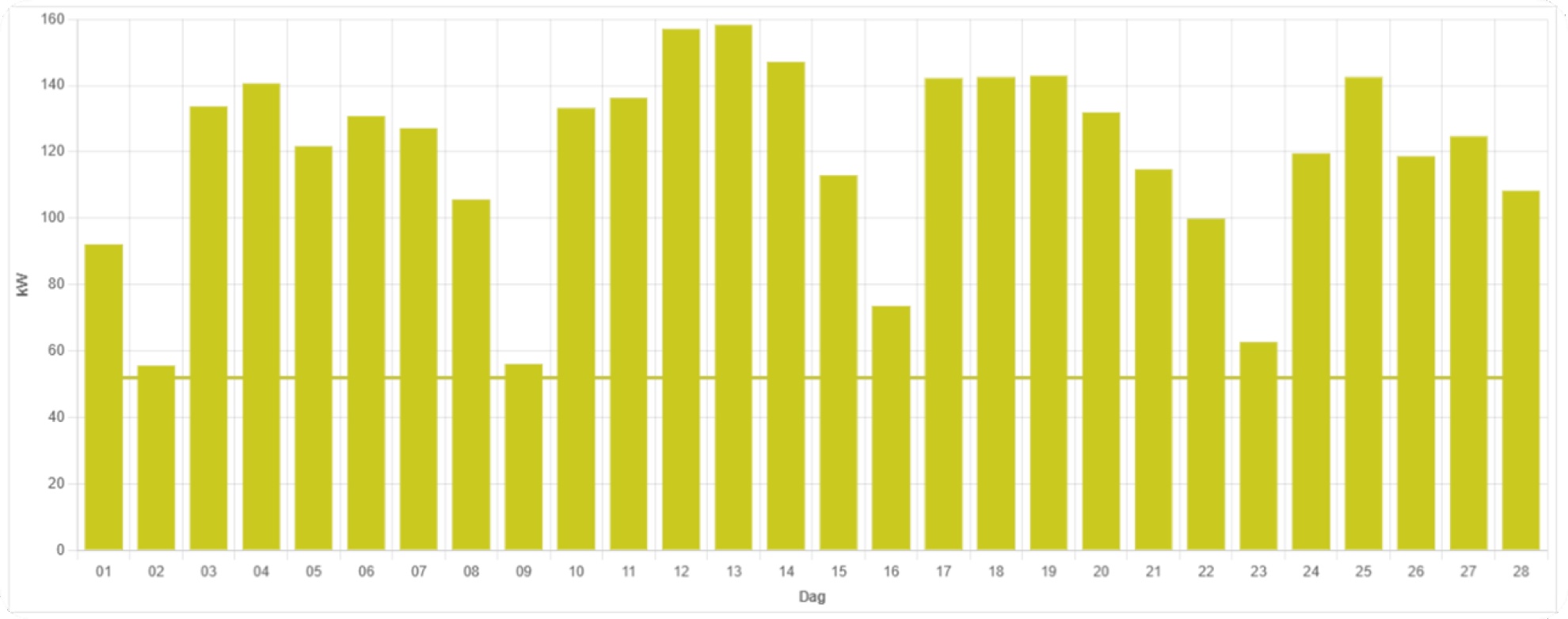 Het vermogensverbruik van het bouwbedrijf per dag op 13 februari. De horizontale lijn geeft het gecontracteerd vermogen aan, 52 kW.