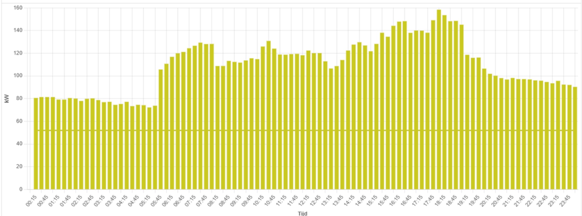 Het vermogensverbruik van het bouwbedrijf per kwartier op 13 februari. De horizontale lijn geeft het gecontracteerd vermogen aan, 52 kW.