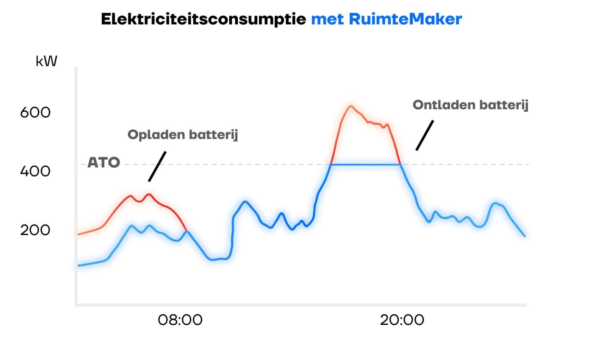 De RuimteMaker laat je meer uit je bestaande aansluiting halen. Een batterij levert stroom op momenten dat je dreigt het gecontracteerd vermogen te overschrijden, en laadt op als je stroomconsumptie ver onder je gecontracteerd vermogen zit.