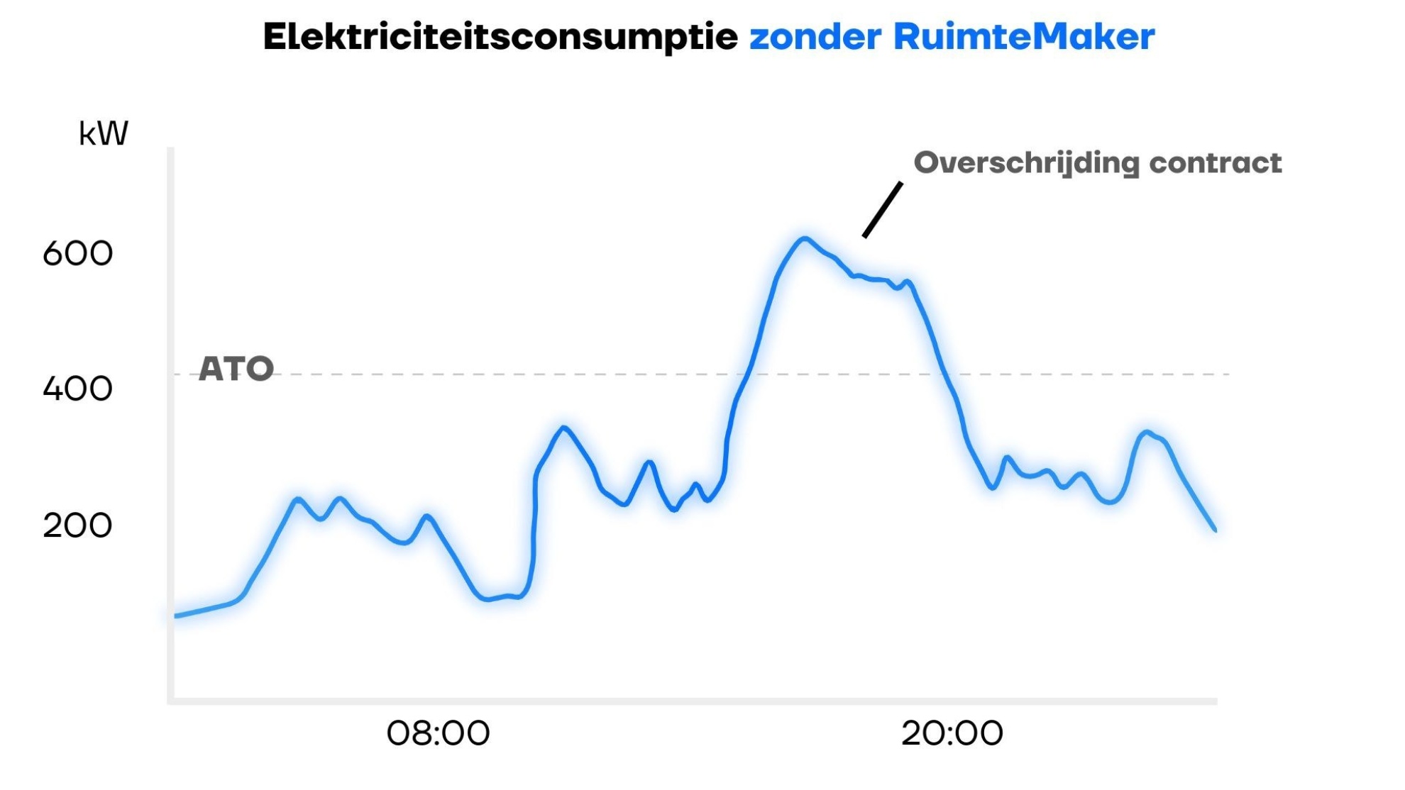 In de grafiek hieronder zie je een horizontale lijn: dat is het gecontracteerde vermogen in KW zoals vastgelegd in de aansluiting- en transportovereenkomst (ATO), hieronder zo’n 450 KW. Zonder ingrijpen zouden de pieken in het energieverbruik daar regelmatig bovenuit komen. Dat is een risico: wie structureel over het gecontracteerde vermogen heen gaat, krijgt eerst waarschuwingen van de netbeheerder, gevolgd door boetes en in het uiterste geval een afsluiting.