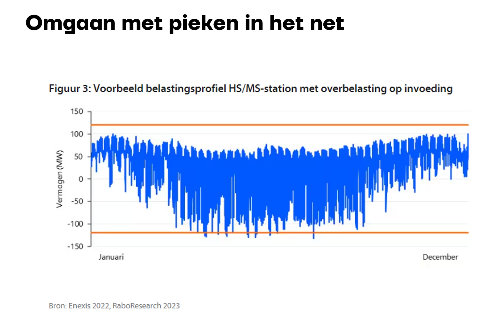 De oranje lijnen zijn de grenzen van wat het net aankan. Alles daarbuiten is overbelasting en dus een risico dat voorkomen moet worden. In dit voorbeeld zie je vooral in de zomer forse pieken naar beneden door een overvloed aan zonnestroom. De grens van het stroomnet wordt zelfs meermalen overschreden.