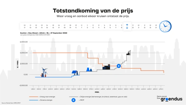 Op het moment dat er een overvloed aan aanbod is van de voordeligere productie-installaties - en dat zijn in de huidige markt vaak de zonne- en windcentrales – ligt de uurprijs laag. Op het moment dat er meer vraag is dan (duurzaam) aanbod, worden vaak gascentrales ingezet om het verschil tussen vraag en aanbod aan te vullen. Gas is door speculaties over te verwachte tekorten momenteel veruit de duurste bron. De gasprijs was in 2022 tot wel 17 keer hoger dan begin 2021. Daarmee is de elektriciteit die met gas wordt geproduceerd voor dat uur prijsbepalend. Dit maakt de gemiddelde dagprijzen torenhoog. En dat wordt rechtstreeks doorbelast aan de afnemers.