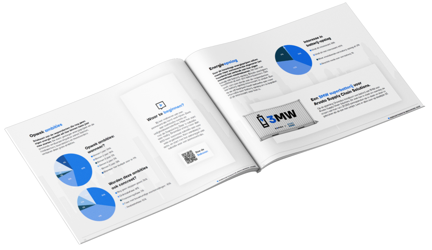 De inzichten in de Energietransitie Benchmark komen voort uit uitgebreide gesprekken met bijna 200 aanjagers en beslissers van bedrijven die hun eerste stappen in de energietransitie hebben gezet. Het rapport brengt de impact van de energiecrisis en van netcongestie in kaart. Ook lees je exclusieve gesprekken met duurzame koplopers zoals HAK, Arvato Bertelsmann en Deloitte.